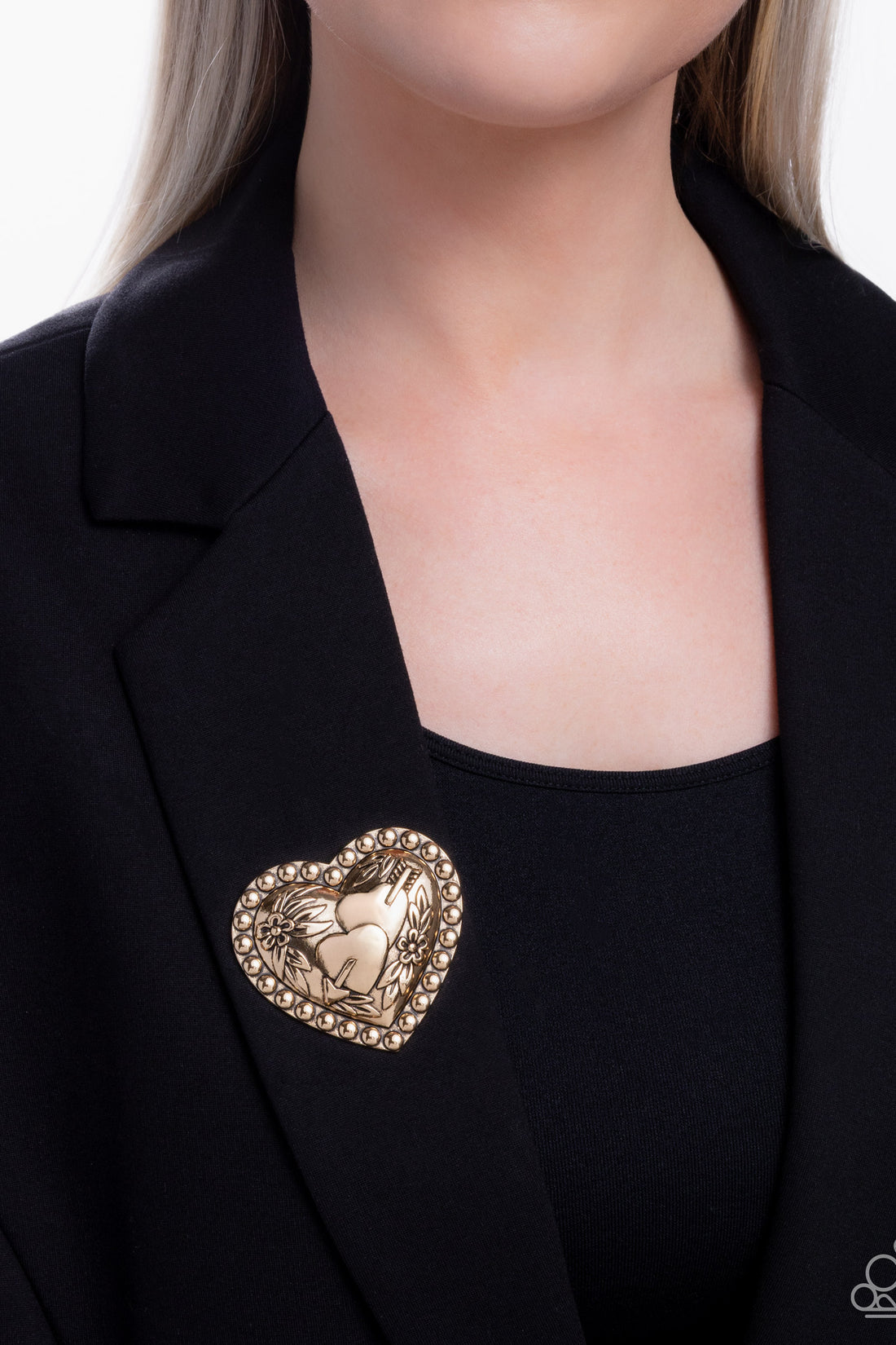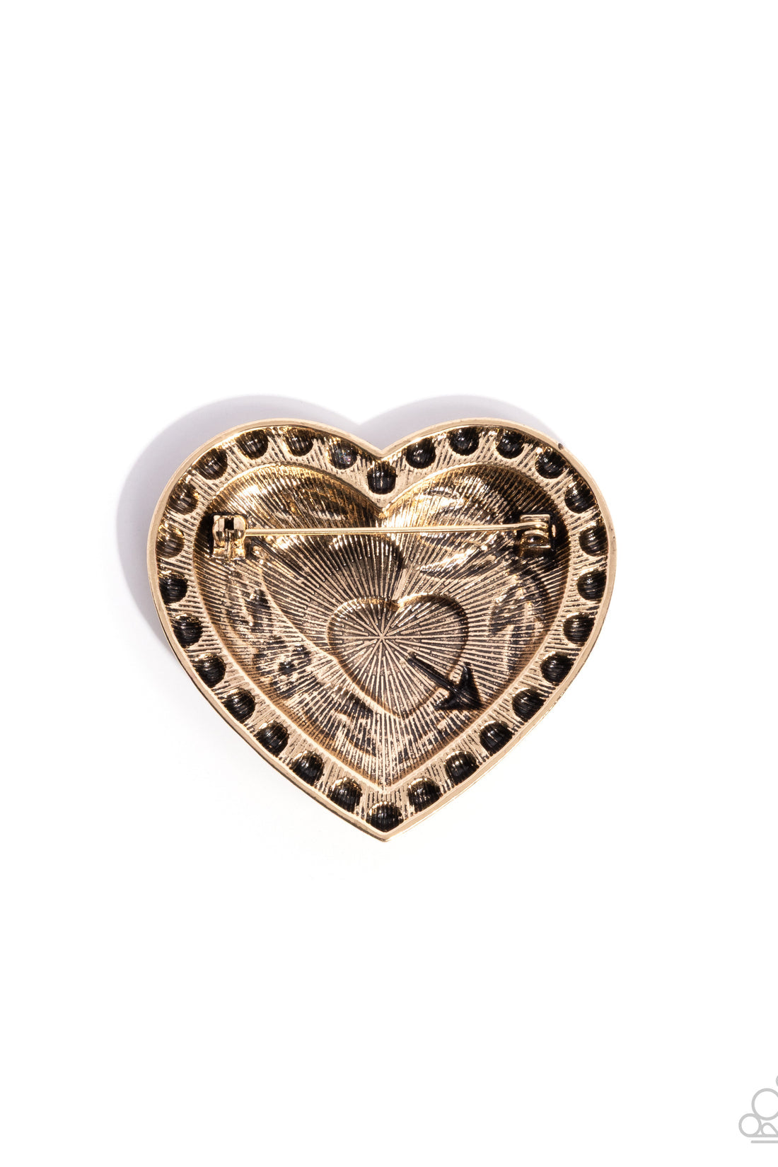 Embossed with antiqued gold flowers and a duo of antiqued gold hearts threaded with a cupid's arrow, an antiqued gold stud-bordered heart stands out as a romantic centerpiece. Brooch measures approximately 2" in length and 2 1/4" in width.
