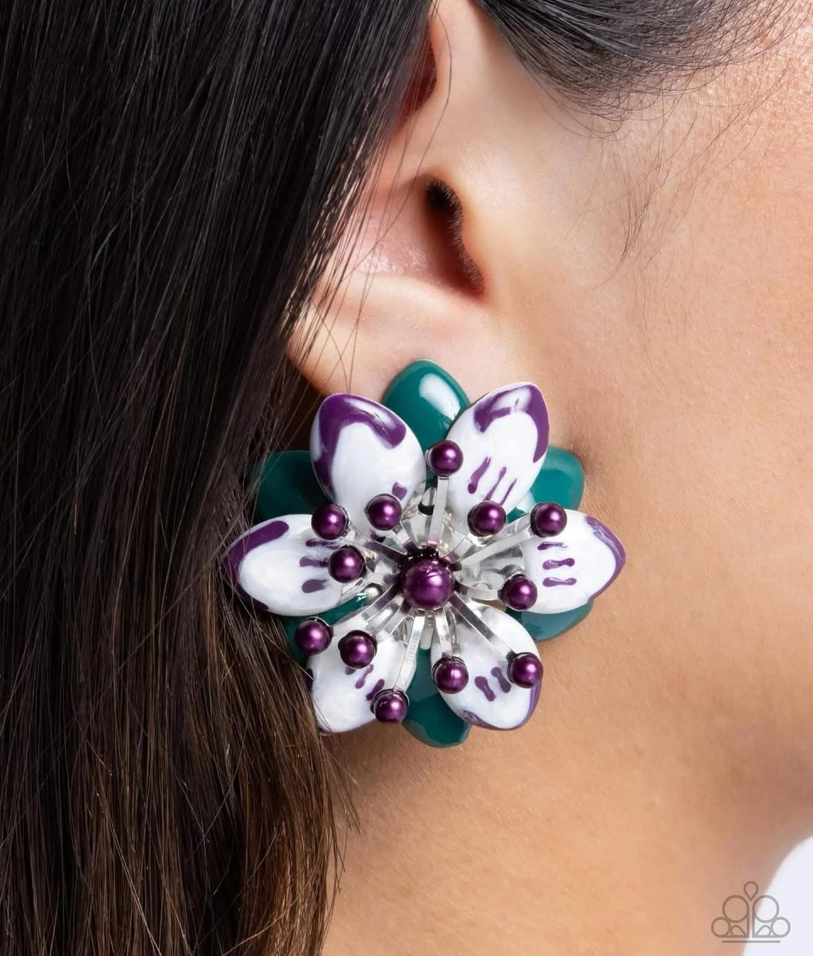 Featuring a Plum pearl center, a whimsical collection of Plum-swirled, pearlized painted petals explode around the ear in a fantastical floral display. Additional Plum pearls dot along blooming silver filament bars while Aventurine-painted petals frame the glistening flower for a three-dimensional finish. Earring attaches to a standard post fitting.