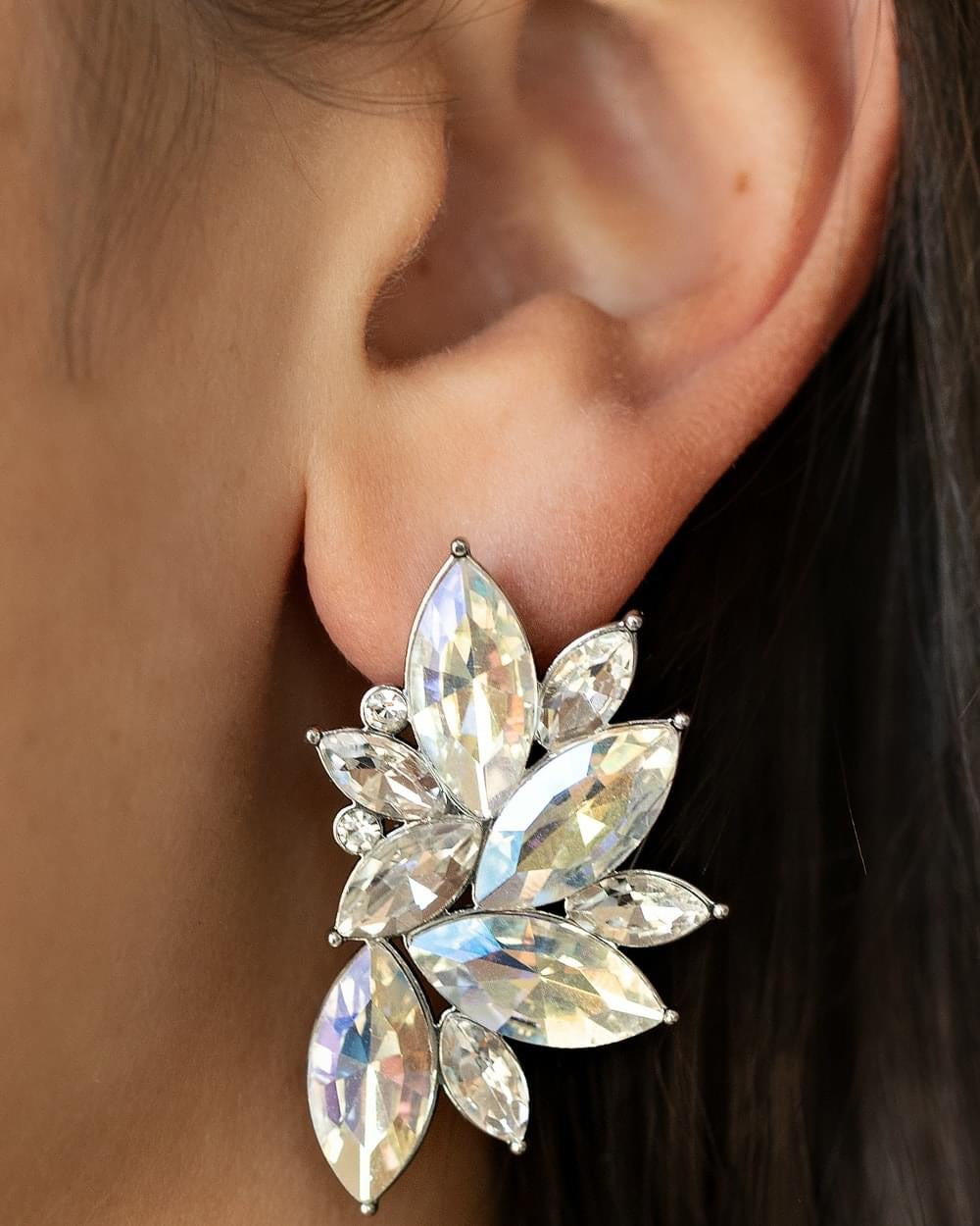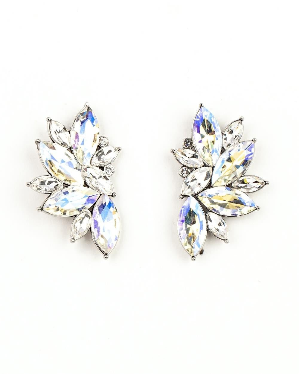 Infused with dainty white rhinestones, a stellar display of iridescent and white marquise cut rhinestones fan out into a spectacular centerpiece. Earring attaches to a standard post fitting.