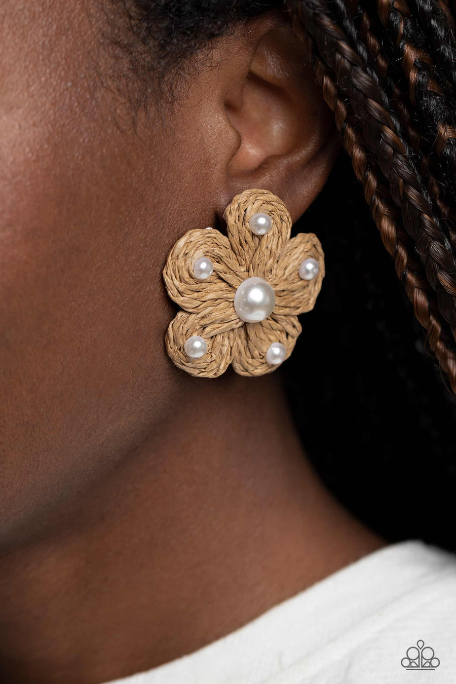 Pearls in varying sizes, sporadically dot the front of a tan straw-like woven floral centerpiece for a beachy flair. Earring attaches to a standard post fitting.