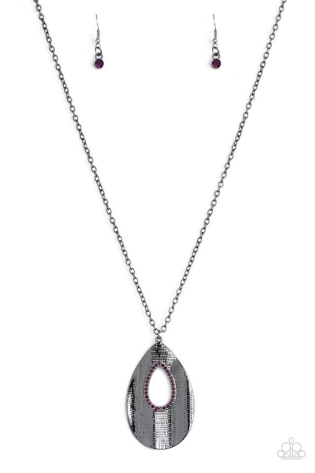 A gunmetal teardrop pendant, embossed in a geometric pattern, dangles elegantly from a matching chain. Sparkling purple rhinestones surround the center, adding a touch of glamour. This unique piece comes with matching earrings and features an adjustable clasp closure.