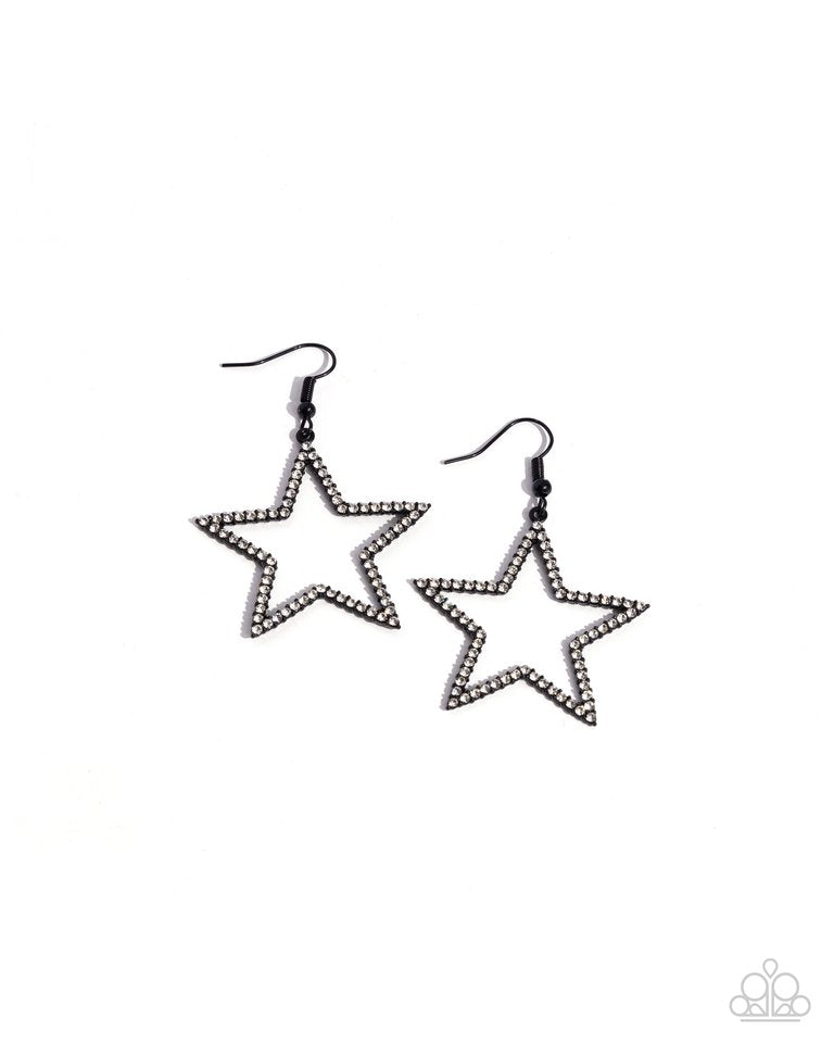 Radiating with elegance, these dangle earrings feature a striking black-painted star frame adorned with shimmering white rhinestones. Capturing the essence of the night sky, this accessory makes a dazzling statement piece. The design suspends effortlessly from a classic fishhook fitting, ensuring both comfort and style. Elevate your look with a touch of celestial charm and brilliance.