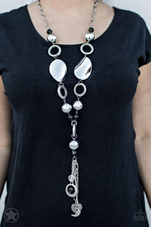 Long chain of black crystalized beads, curved plates of silver with a pearly finish, and chunky silver rings lead down to a tassel of chains and charms, including a crescent moon and a heart. Sold as one individual necklace. Includes one pair of matching earrings.
