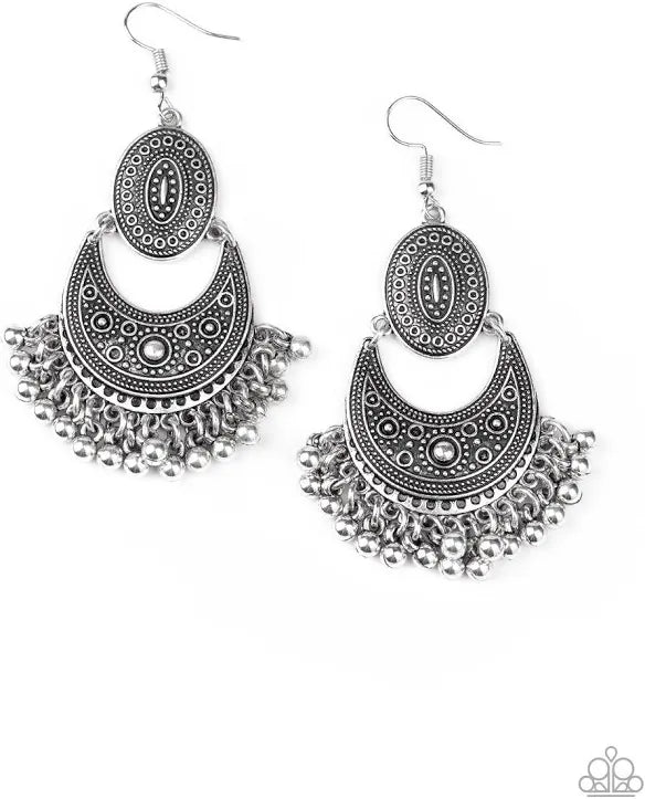 Dainty silver beads dangle from the bottom of an ornate crescent shaped frame that swings from a decorative silver oval frame, creating a noisy fringe. Earring attaches to a standard fishhook fitting.